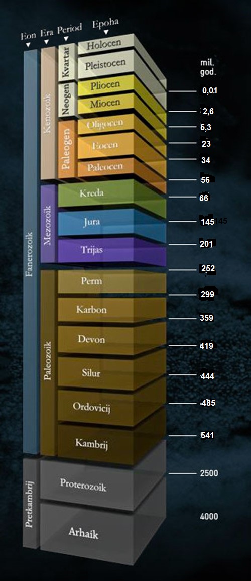 Kako bismo se lakše snalazili u tom nepreglednom, milijardama godina dugom vremenskom razdoblju geološke povijesti Zemlje, geolozi su još početkom 19. stoljeća osmislili tzv. geološku vremensku tablicu, određenu podjelu kojom se to iznimno dugo razdoblje razdijelilo na duža i kraća vremenska razdoblja kojima su nadjenuli određene nazive. Podjela se temeljila na nekim važnim fosilnim nalazima ili značajnim događajima koji su utjecali na razvoj života i stvaranje reljefa na Zemlji. U toj podjeli najduže vremensko razdoblje naziva se eon, nešto kraće vremensko razdoblje je era, još kraće jest period, pa epoha, još kraće je kat (doba), pa potkat itd.